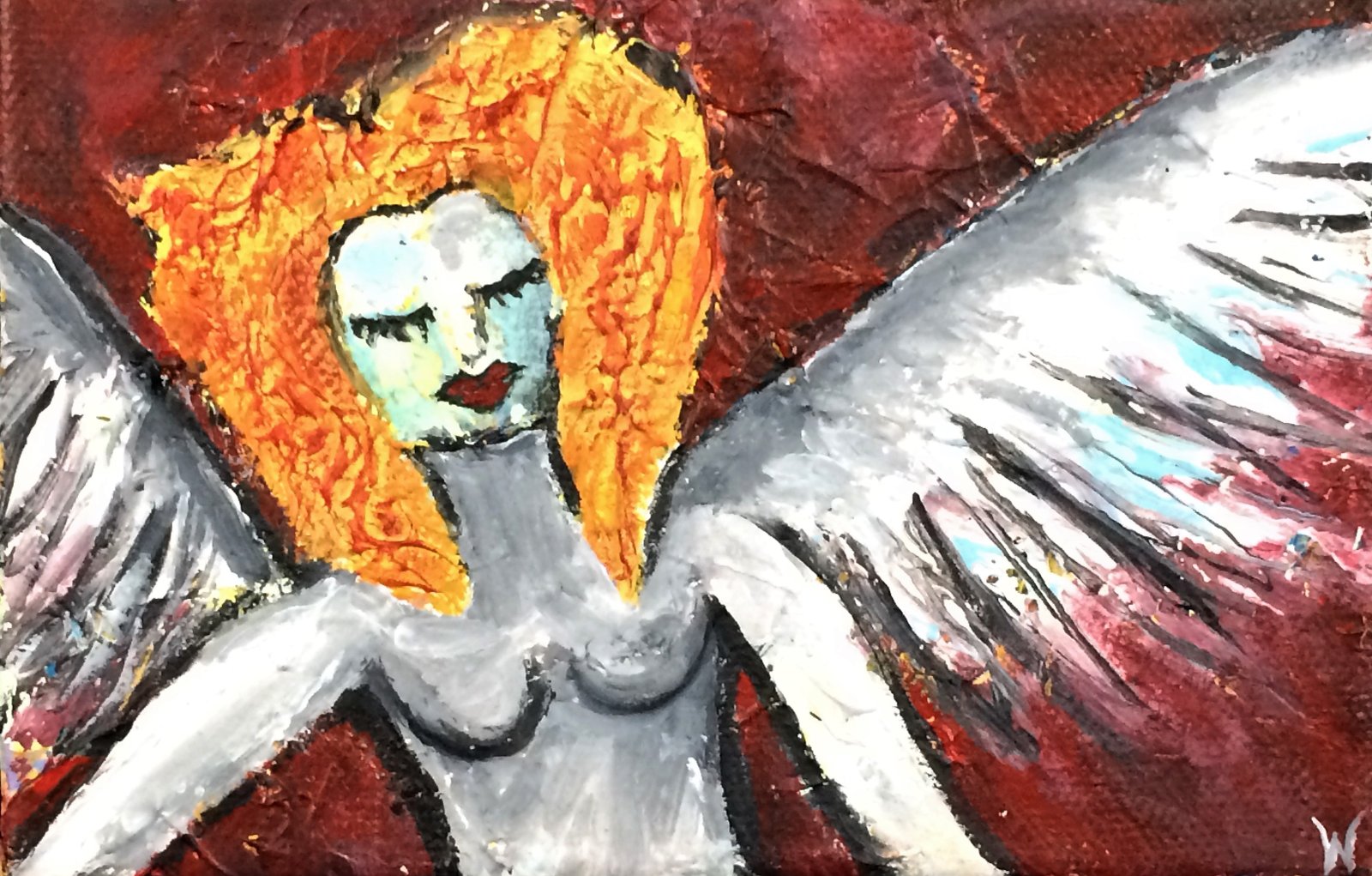 Previous ImageNext Image Blood Swan Angel by Wolff Bowden The Painted Poet Blood Swan Angel, 4×6″ HxW Mixed Media on Gallery Wrapped Canvas (No Frame Necessary)