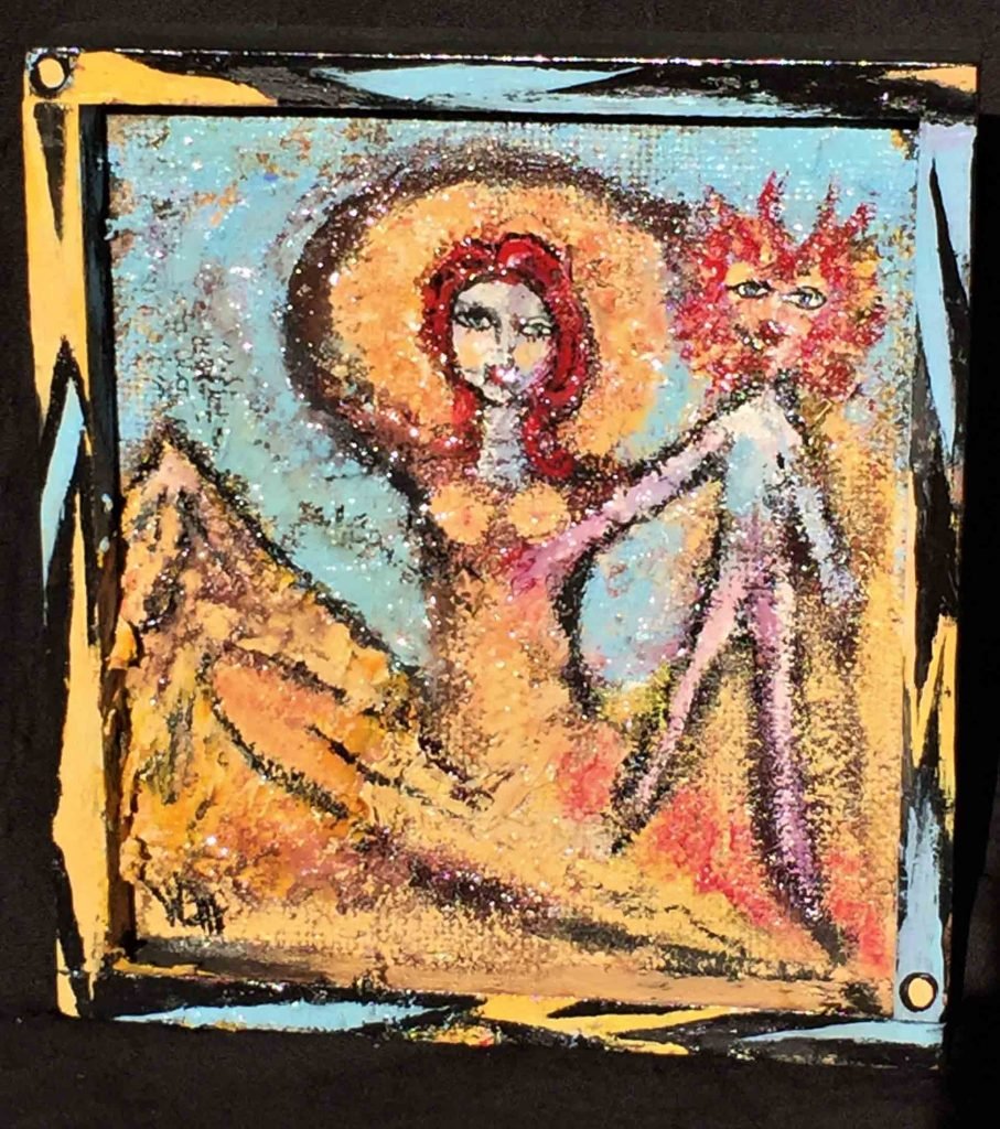 Previous ImageNext Image Red Lion Yoga Red Lion Yoga, 9×8″ HxW Mixed Media on Burlap (Frame is Part of Artwork)