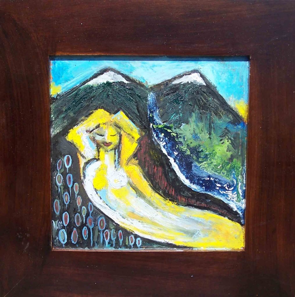 Previous ImageNext Image Night Mountain Princess Night Mountain Princess, 9×9″ HxW (painting), 14×14″ (frame+painting), Oil Paint & Mixed Media on Wood (Frame is Part of Artwork)