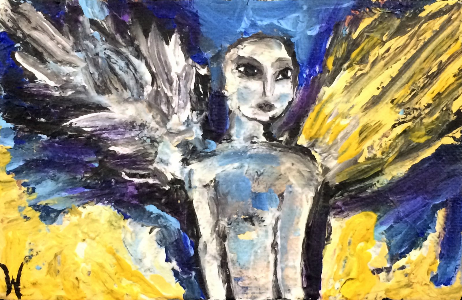 Previous ImageNext Image Saffron and Ice Angel by Wolff Bowden The Painted Poet Saffron & Ice Angel, 4×6″ HxW Mixed Media on Gallery Wrapped Canvas (No Frame Necessary)